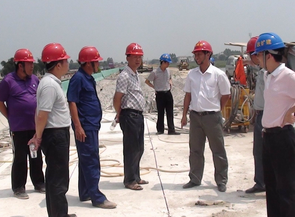 圖為李總經(jīng)理(左四)在舊橋破碎施工現(xiàn)場(chǎng)指導(dǎo)工作