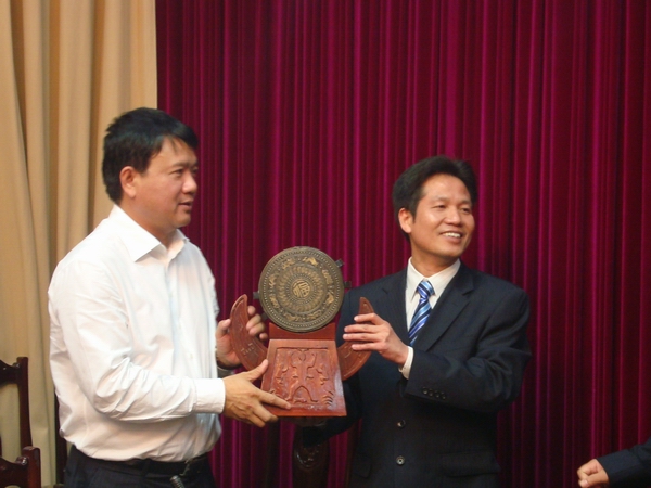 集團(tuán)公司董事長朱堅和(上圖右)與越南交通運(yùn)輸部部長丁羅升先生交換禮物。