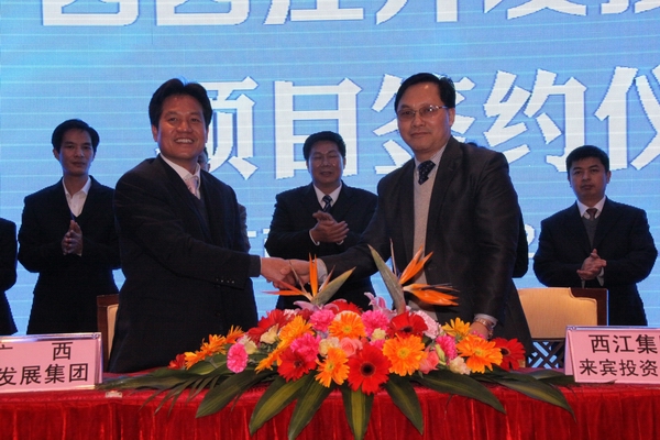 圖為:2月27日,圖為朱堅(jiān)和董事長(zhǎng)(左)與廣西西江開發(fā)投資集團(tuán)代表簽署合作意向協(xié)議