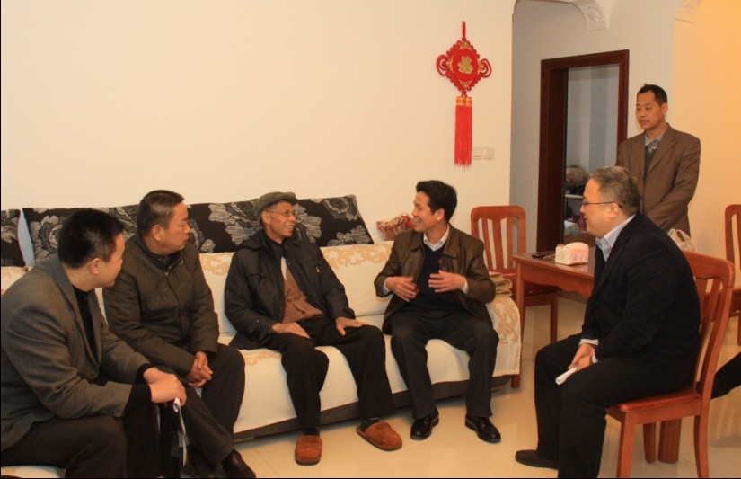 集團公司董事長朱堅和(左四)、黨委副書記張友坐(左二)慰問困難職工