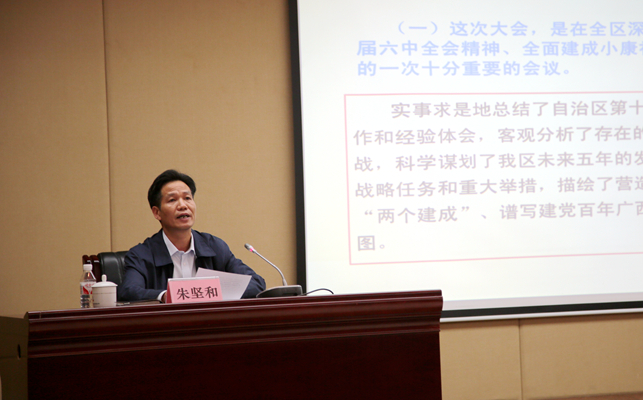 在講解到深刻領會、準確把握黨代會精神時,朱堅和從七個方面講解了大會的重要精神和目標任務。其中,著重講解了今后五年全區發展的總體要求和奮斗目標,即營造“三大生態”、實現“兩個建成”。