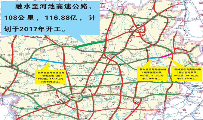融水至河池高速公路是自治區重點推進的縣縣通高速公路項目之一,是廣西高速公路路網規劃中“橫2支線”——桂林至河池高速公路的重要構成路段。項目起于柳州市融安縣潭頭鄉紅嶺村附近,與擬建的桂林至柳城高速公路連接,并與三江至柳州高速公路相交,終于宜州市德勝鎮全村附近,與宜州至河池高速公路相接。主線全長約108公里,設計車速100公里/小時,路基寬度 26米,采用雙向四車道高速公路標準。項目采用“區市共建”模式建設,總投資估算116.88億元,計劃于2021年12月建成通車。項目建成后,將結束羅城縣不通高速公路的歷史,公路網絡互聯互通將更加完善,公路沿線群眾出行將更加快捷,沿線市、縣、鎮、鄉的旅游產業、經濟發展以及扶貧攻堅事業將得到極大的促進。