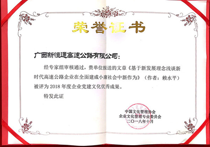 會上,由賴水平撰寫的文章《基于新發展理念淺談新時代高速公路企業在全面建成小康社會中新作為》在企業黨建文化優秀成果評比中,被評為2018年度企業黨建文化優秀成果;由新恒通公司都巴指揮部創作團隊拍攝的《遷動人心》微電影榮獲“最美企業之聲”代言作品榮譽稱號。